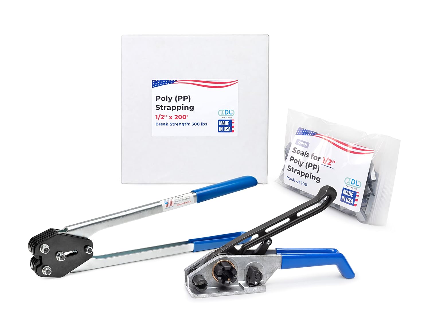 The Industrial Polypropylene (PP) Strapping Kit includes: 1 roll of black 1/2 inch x 9000 feet hand grade polypropylene (PP) strapping with 8 inch x 8 inch core size and 300 lbs break strength; pack of 1000 open seals; P-330 polypropylene strapping tensioner (durable banding tool with a cutter works both with polyester and polypropylene strapping); C-3004 front action polypropylene strapping sealer/crimper (regular duty manual sealer with heat-treated steel parts).All consumables including strapping, seals and buckles can be reordered separately.This Industrial Grade Kit is a high-performance solution with a large strapping roll and with (or without) cart/dispenser for additional mobility. Perfect for high-volume and intensive strapping works.We also offer two other options of complete strapping solutions that include pre-picked strapping products that work perfectly together. Portable — versatile and affordable kit for medium-volume works. Portable Ultimate — complete strapping kit equipped with strapping box/dispenser to keeps strapping coils neat and ready to use.The full range of strapping kits you can find at our IDL Packaging Amazon Brand Store. We presented the wide variety of strapping solutions for efficient and quick strapping of any volume, weight and shape of packaging.